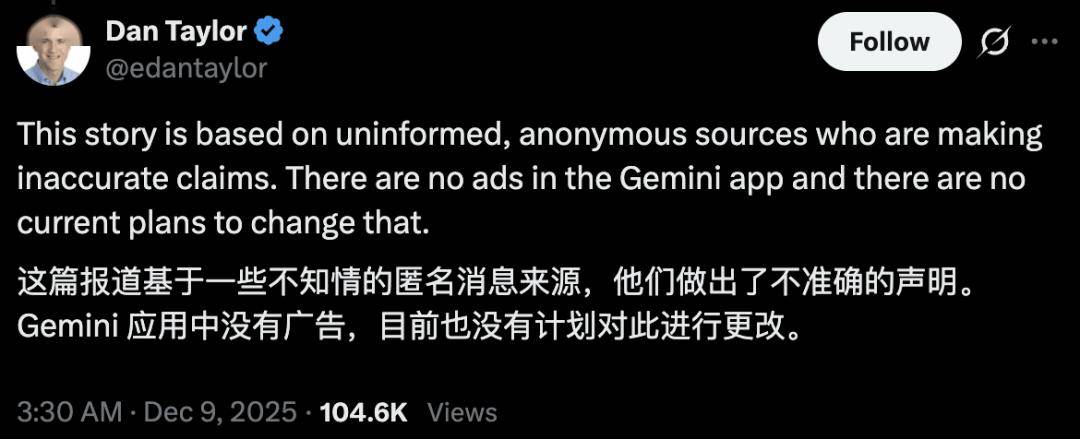 他表示Gemini应用中目前没有广告,也暂无添加广告的计划,并指出广告目前仅在美国的英文版AI概览(AI Overviews)中展示。
