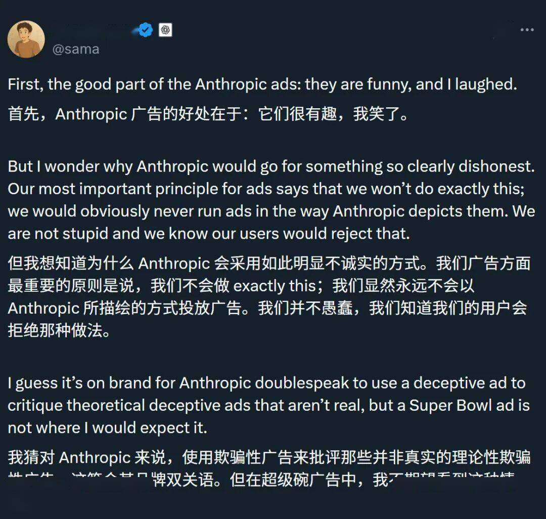 Claude这一套组合拳,精确击中了ChatGPT即将在免费版中引入广告计划的软肋,OpenAI的掌门人奥特曼直接破防,深夜甩出长文回击。