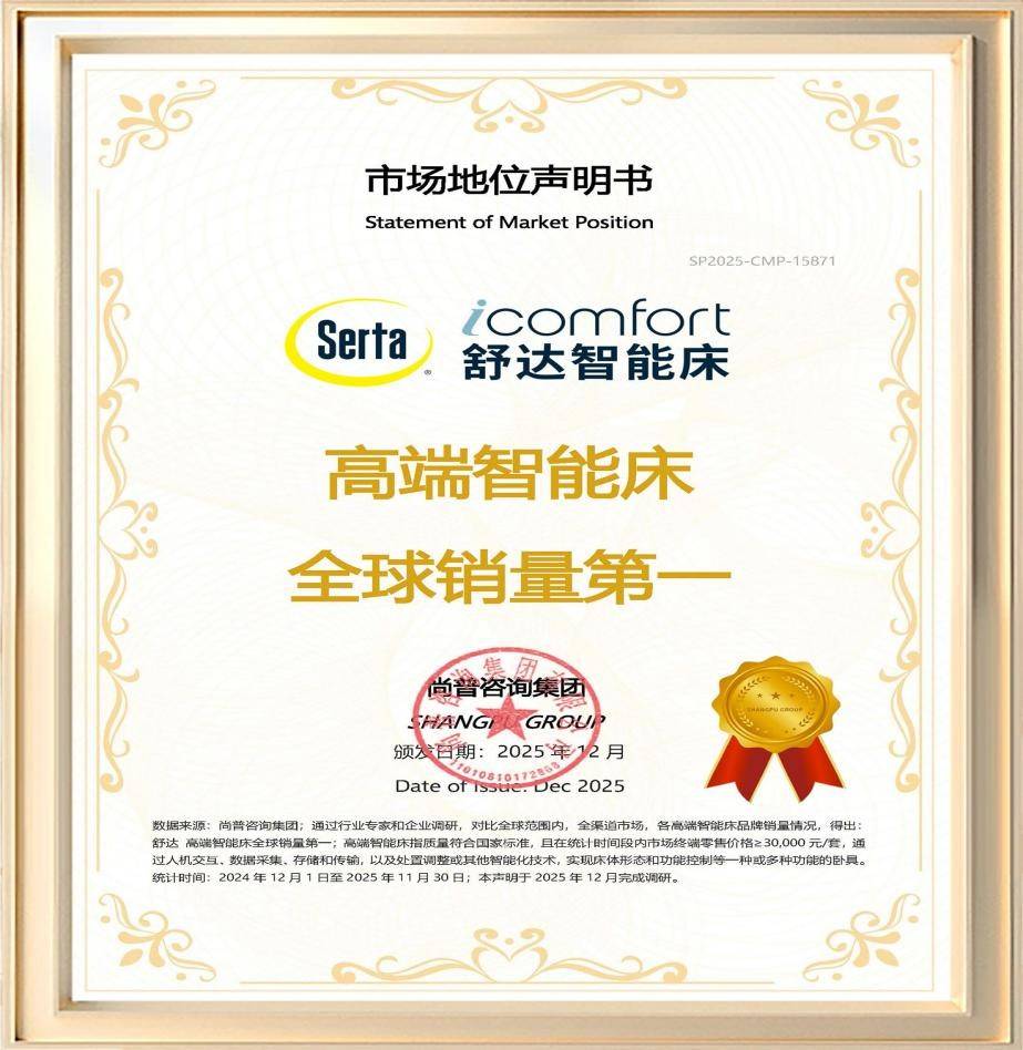 2025年12月,尚普咨询集团基于全球全渠道零售数据(终端售价≥30,000元/套)发布认证:舒达高端智能床全球销量第一——这一成果不仅印证了其技术领先性,更彰显其在全球高端市场的商业落地能力。