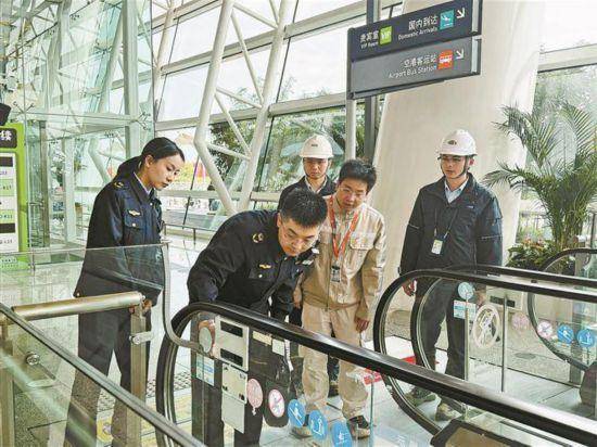 湖里区市场监管局在高崎机场T4航站楼重点检查自动扶梯、垂直电梯等设备的运行维护情况。